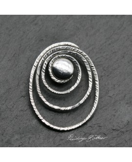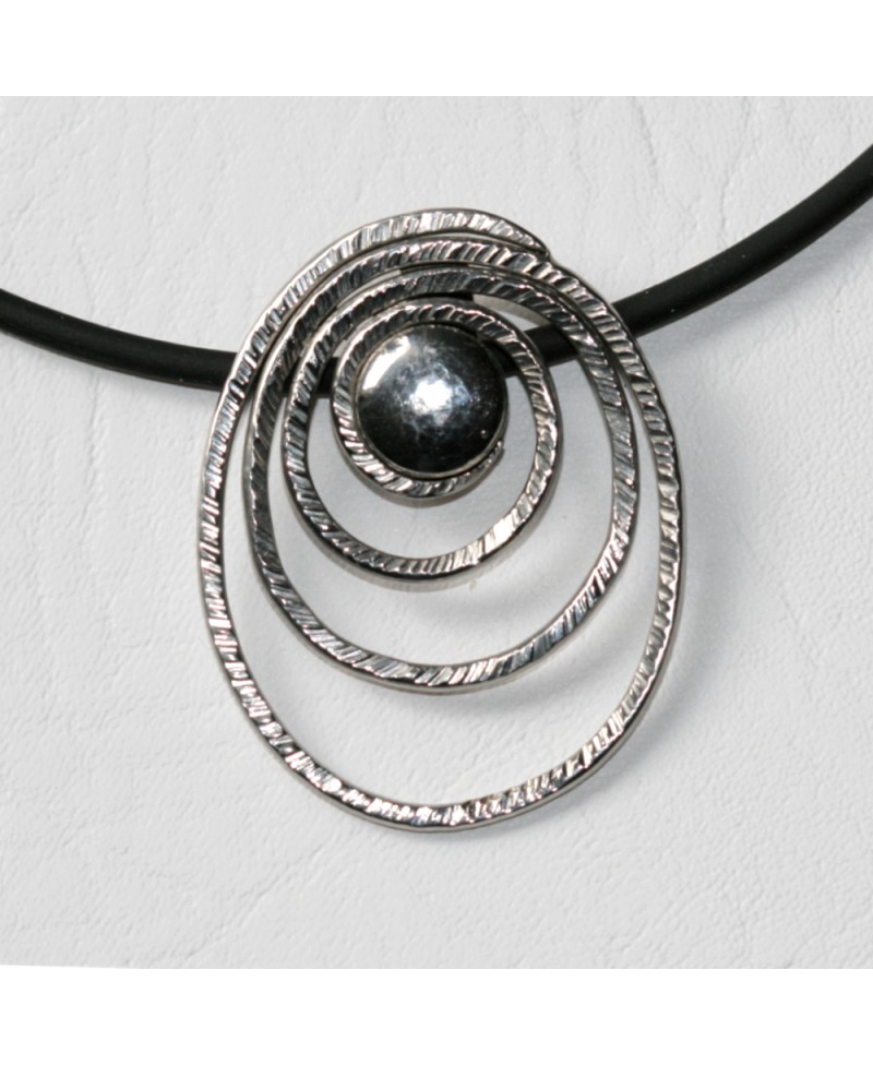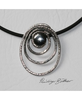 Der Kettenanhänger Spiral Ei hat eine Runde gehämmerte Scheibe im inneren, Sie spiegelt das Leben wieder das durch die Spirale nach außen getragen wird.